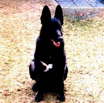 The arrival of the breeder in the lot caused my heart to take a jump. As she brought out our new prospect and she turned to face me it seemed like everything stood still for an instant. There sitting in front of me looking up into my eyes was the most beautiful black female German Shepherd with a perfect silohette of a white winged "Dove" in flight dead center on her chest. I was speechless so much so that the breeder thought that I did not like the looks of what I saw. Infact I said nothing until this little girl came right up to me and as I knelt down put her head in my lap and looked at me with the most haunting eyes I'd ever seen.